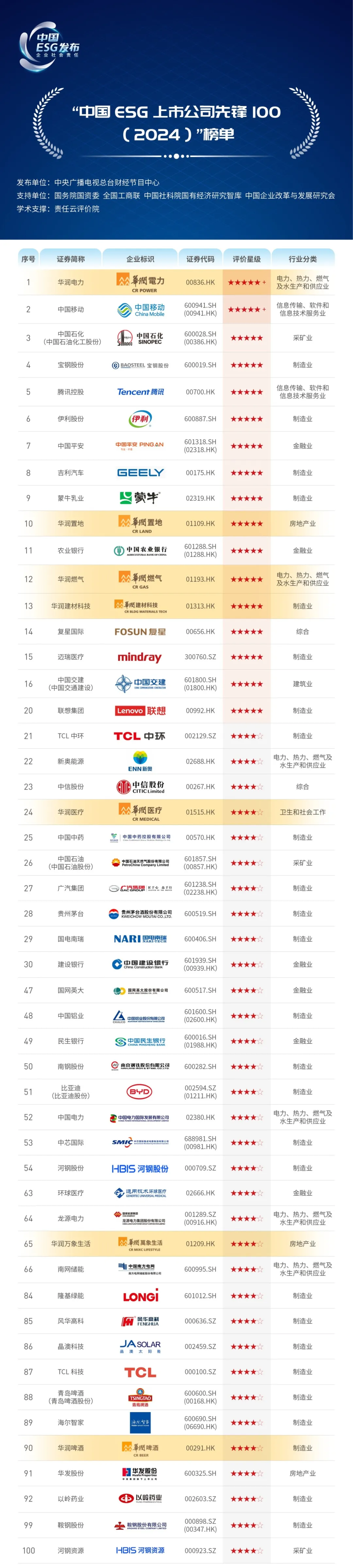 《2024年度ESG行动报告》由中央广播电视总台财经节目中心联合国务院国资委、全国工商联、中国社科院国有经济研究智库、中国企业改革与发展研究会等部门共同发布。其中,“中国ESG上市公司先锋100”榜单以截至2024年4月30日的A股、H股的6471家中国上市公司为样本池,依据上市公司市值规模、ESG报告发布情况、影响力、ESG活跃度等要素,筛选出972家上市公司作为评价对象进行ESG综合评价,最终评选出100家ESG先锋企业。