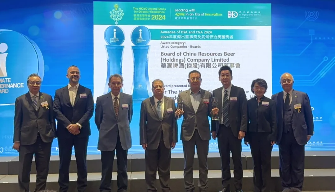 11月28日,华润啤酒(控股)有限公司(港交所股份代号:00291(港币柜台)及80291(人民币柜台))(“华润啤酒”或“本公司”,连同其附属公司,统称“本集团”)在香港董事学会董事嘉奖系列2024的上市公司董事会类别中,再度荣膺“杰出董事奖”,并荣获今年新增设的“气候管治奖”。今年是华润啤酒连续三年获得“杰出董事奖”,成为过往24年来首家连续三年获得该殊荣的上市公司。这次同时摘得两项大奖彰显了华润啤酒董事会在企业管治及环境、社会及管治(ESG)方面的领导能力及卓越表现。