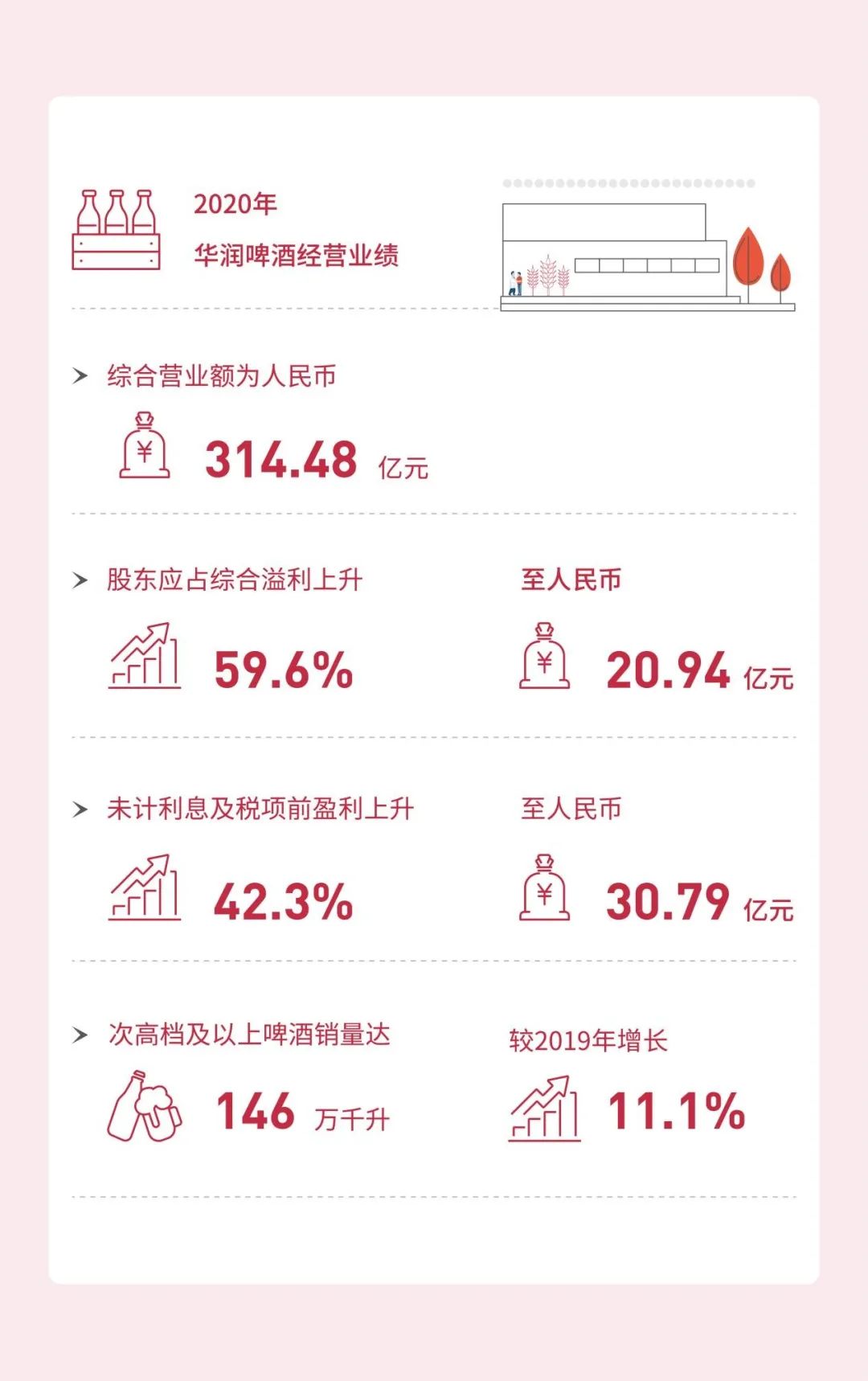 不仅在环境建设方面大有作为,在这份报告里,还能看到华润雪花啤酒在疫情重压的2020年保持“决战高端,质量发展”战略定力,勇做行业逆行者,取得了史上优异的利润成绩,销量连续15年位居全国第一。