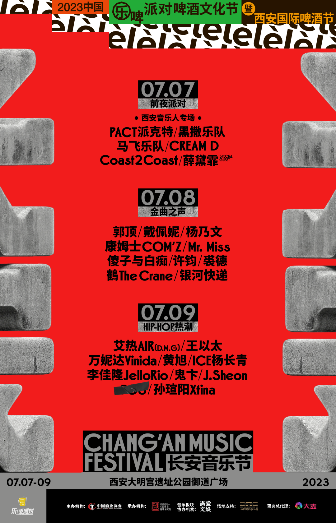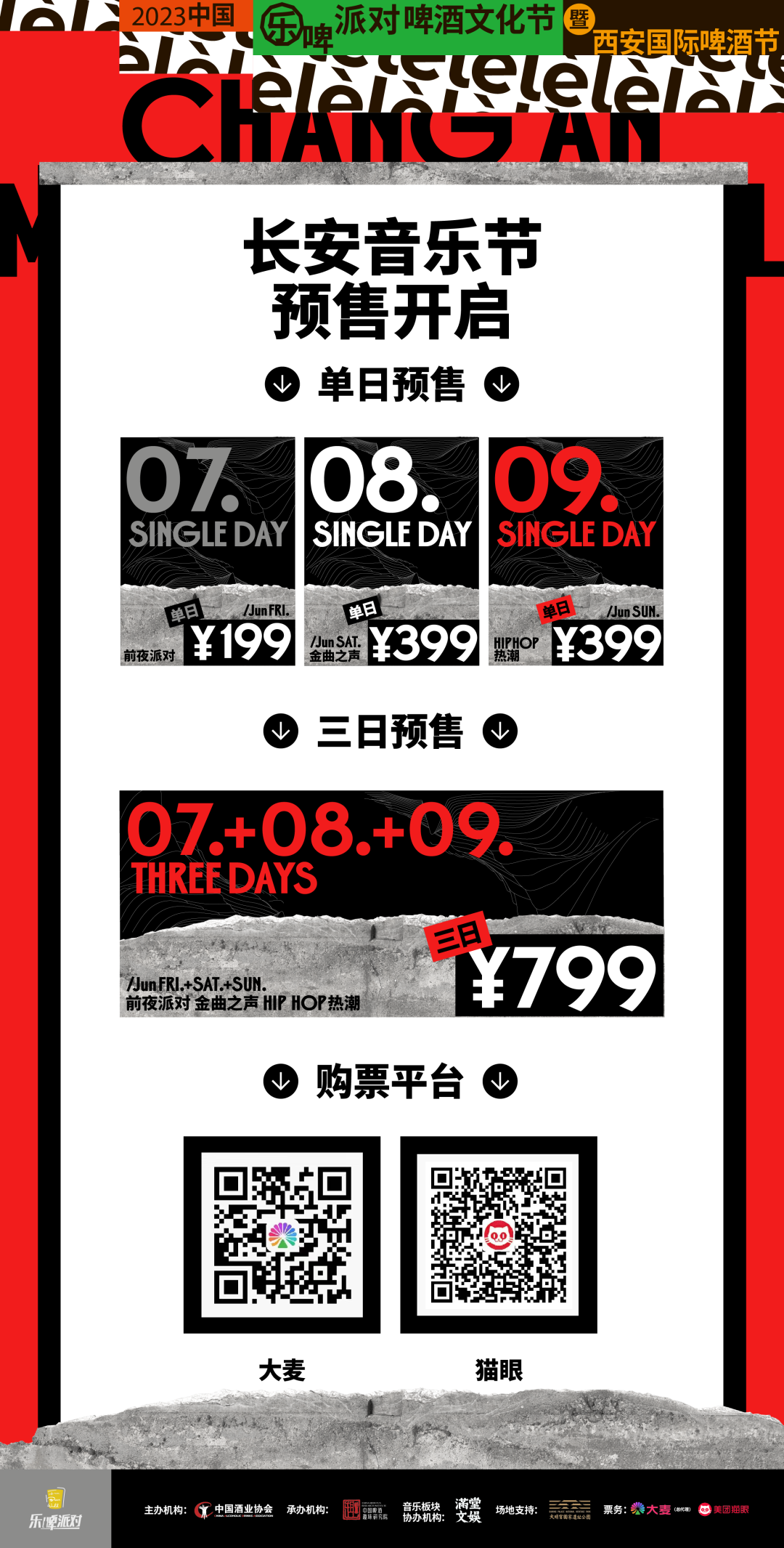 暨西安国际啤酒节 【长安音乐节】 现已开启预售7月7日至7月9日,2023中国“乐啤派对”啤酒文化节暨西安国际啤酒节将于西安市大明宫遗址公园御道广场正式举办。该项目是由中国酒业协会发起并主办,中国啤酒品类声誉和优势文化基金支持,中国啤酒行业TOP5企业——华润雪花、青岛啤酒、百威中国、燕京啤酒、嘉士伯中国及京东超市联合发起并协办,视觉中国、青年艺术100、科复时代等机构合作支持,中国啤酒趣味研究院独家运营。作为啤酒文化节同期重要板块,中国啤酒趣味研究院联合满堂文娱 ,集结本土音乐力量、多元音乐审美和顶尖艺人阵容,全力打造属于这个夏天的大型音乐盛会,与万人一同沉浸在律动中,体会真正的激情澎湃!啤酒与音乐,夏日与我们,不见不散!🎫官方售票平台:大麦、猫眼单日预售票:199/399/399三日预售票:799在11万平米的超大主题空间,悦耳动听的音乐搭配酣畅淋漓的啤酒,体验8大跨界啤酒文化展示项目。相信你一定能在文化古都西安碰撞出不一样的激情与活力。