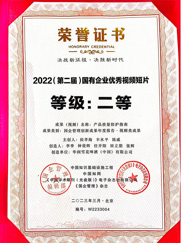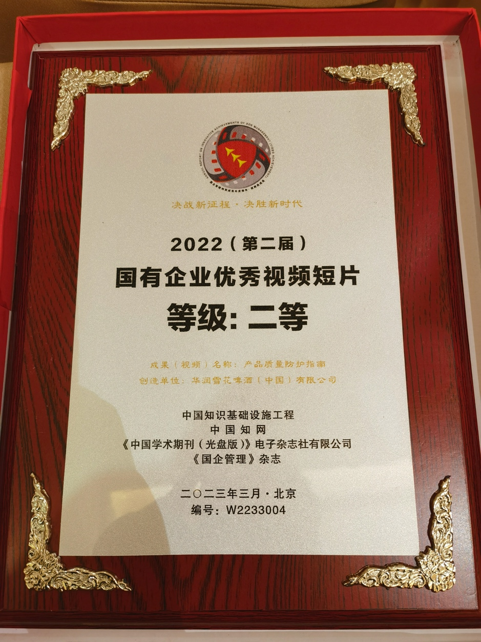 近日,由中国企业管理研究会、中国知网和《国企管理》杂志联合主办的2023国企管理智库大会暨国企管理创新成果发布仪式在京隆重举行。151项具有新时代特色,可复制、可推广、高质量的课题成果对外发布。经过层层筛选,华润雪花啤酒选送的《产品质量防护指南》教学视频荣获国有企业优秀视频短片二等奖。