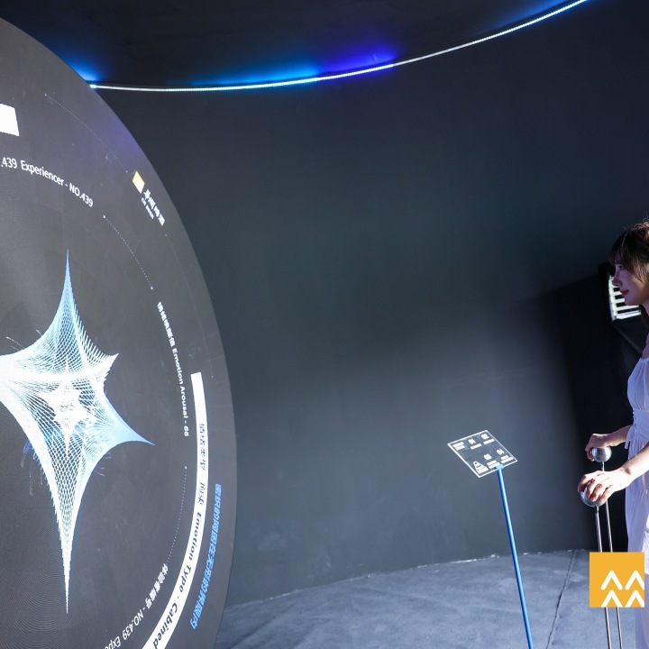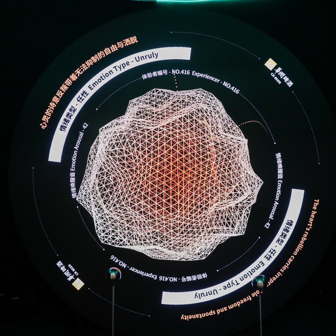 其中,备受瞩目的《情绪几何5.0》由2023年春晚视觉总监、知名艺术家费俊与代数几何数学家许晨阳、心理学家刘正奎跨学科合作。该装置可通过生物识别技术,如心率、皮肤电导等生理数据,捕捉和计算出观众的情绪状态并生成个性化图像,表达“克制”“愉悦”“纠结”等多种情绪。此次,经过与华润啤酒深度定制化合作,《情绪几何5.0》不仅升级科技感的交互设计,还具备了更强的社交属性,激发前来观展的人用图形分享的方式勇敢表达自我,直面各种情绪。活动现场,人们纷纷测试喝酒前后的情绪不同,与自己同样情绪的伙伴交流,感受情绪的变化。小酌或畅饮,是表达不同情绪的方式,而情绪可视化,同样是希望人们可以更好的感受情绪、接纳情绪。