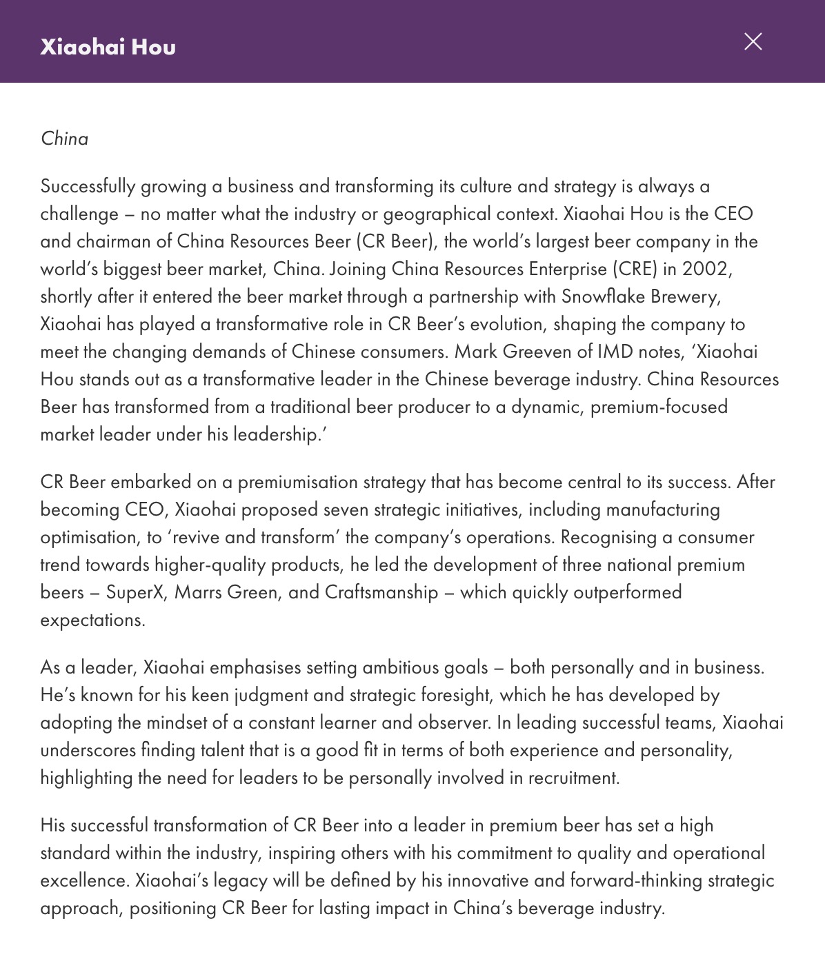 成功发展一家企业并彻底改变其文化与战略,无论在哪个行业或地域环境下,都是一个巨大的挑战。侯孝海是华润啤酒的CEO兼董事长,作为全球最大的啤酒企业,它位于全球最大的啤酒市场——中国。2002年,华润刚通过与雪花啤酒的合作进入啤酒市场时,侯孝海就加入了华润啤酒。自此,他在华润啤酒的发展过程中扮演了变革性角色,推动公司不断适应中国消费者日益变化的需求。瑞士洛桑管理学院(IMD)的马克·格里文(Mark Greeven)评价道:“侯孝海是中国酒水饮料行业中一位极具变革力的领导者。在他的带领下,华润啤酒从一家传统的啤酒生产商转型为一家充满活力、以高端市场为重点的行业领军者。”