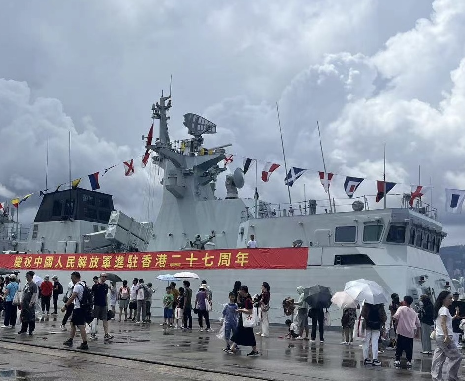 在隆重的升国旗仪式中,军营开放活动拉开帷幕。威武的三军仪仗队护旗而出,现场高声齐唱国歌,军港里各型舰艇伏波静卧,市民们手中的“中国红”迎风飞舞,满场涌动着浓浓的爱国情。