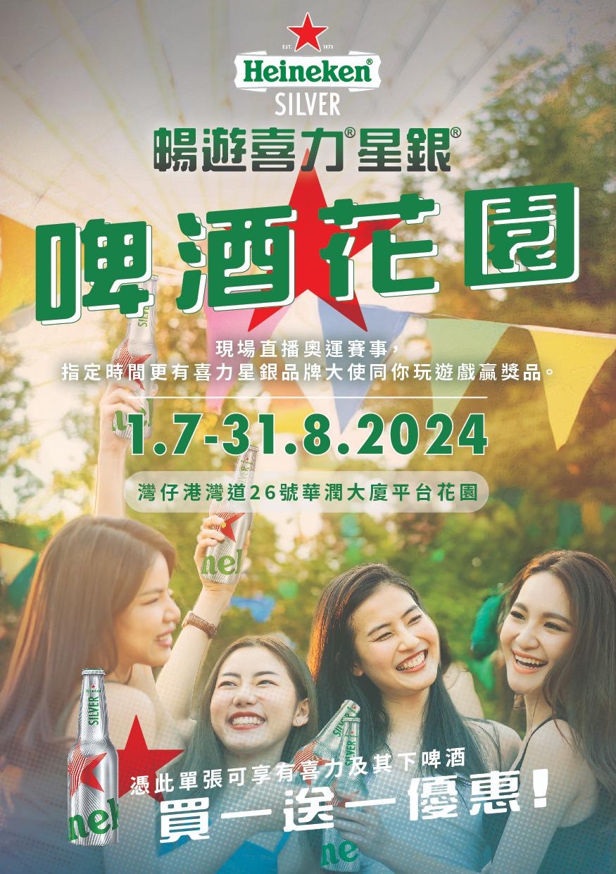 庆回归,优惠多。香港湾仔华润大厦啤酒花园7月1日正式开幕,快来与喜力星银一起看奥运、玩游戏、赢奖品!