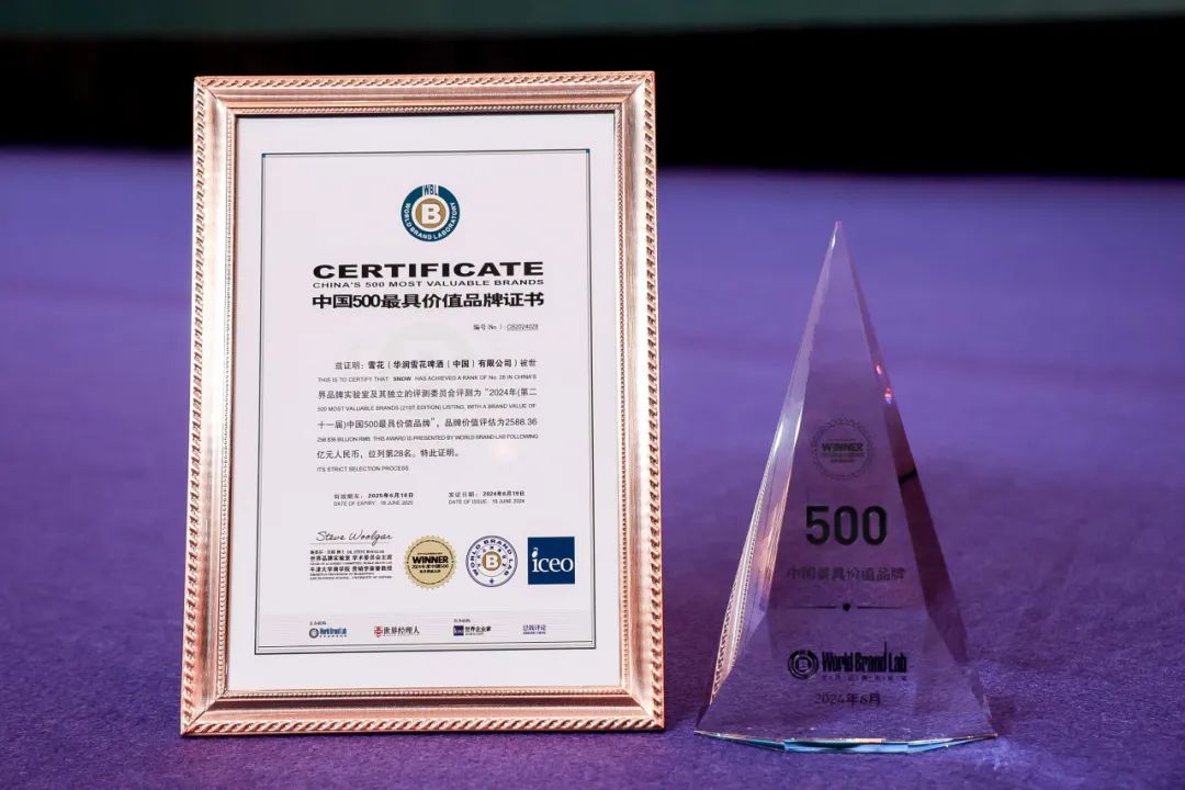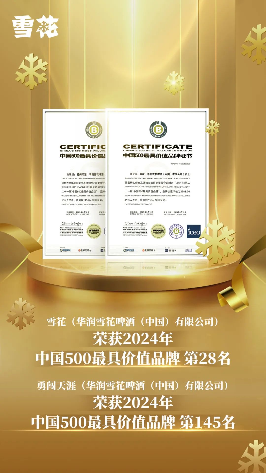 大会上隆重发布了 2024 年《中国 500 最具价值品牌》排行榜,“雪花”与“勇闯天涯”品牌双双荣登此荣誉榜单,品牌价值持续厚增,也彰显了华润啤酒卓越的品牌影响力与市场表现。其中“雪花”品牌连续15年上榜,2024年品牌价值评估为2588.36亿元,稳居榜单第28名;“勇闯天涯”2024年品牌价值评估为817.76亿元,位列第145名,三年登榜以来,排名也在持续攀升。