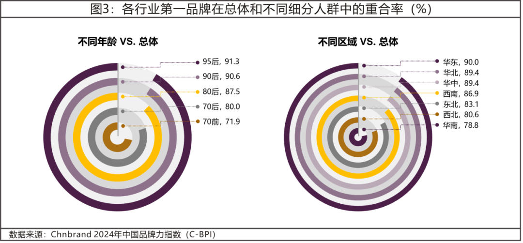 数据显示,95后的第一品牌与总体的第一品牌重合率最高,年轻人无疑已成为第一品牌C-BPI得分的主要贡献者。面对逐渐成为消费主力军的年轻人,品牌的年轻化也成为了必然趋势。