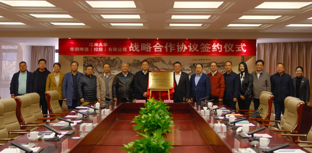 11月27日,华润啤酒(控股)有限公司与江南大学举行了一场深度战略合作的签约仪式。华润啤酒董事会主席侯孝海,副总裁曾申平,技术研究院院长钟俊辉,金沙酒业副总经理邹江鹏,金种子酒业总工程师杨红文,景芝白酒副总经理来安贵等领导以及江南大学党委书记吴正国、原副校长徐岩教授、产业技术研究院副院长谢卫忠等共同出席了联合研发中心的合作签约、揭牌仪式等一系列活动。