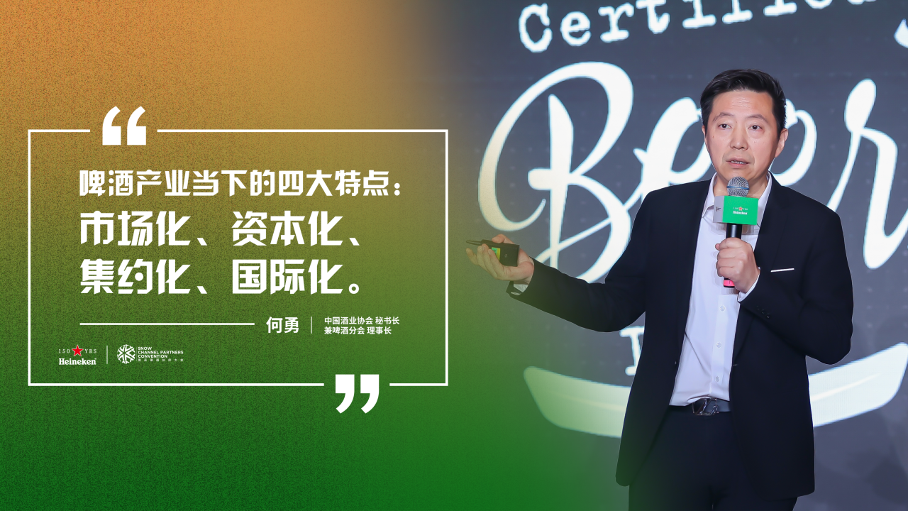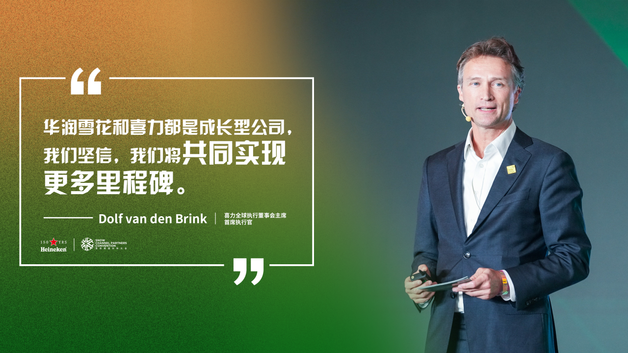 中国酒业协会秘书长兼啤酒分会理事长何勇、华润啤酒董事会主席侯孝海、喜力®全球执行董事会主席兼首席执行官Dolf van den Brink、喜力®亚太地区总裁Jacco van der Linden、华润啤酒总裁赵春武、华润雪花总部营销中心总经理宋占民及国际品牌部总监张睿喆、中国品牌部总监张巍、客户发展部总监兼营销数字化部总监王伟健等领导,与来自全国的重要渠道伙伴代表齐聚一堂,共商共建“啤酒新世界”事业共同体。