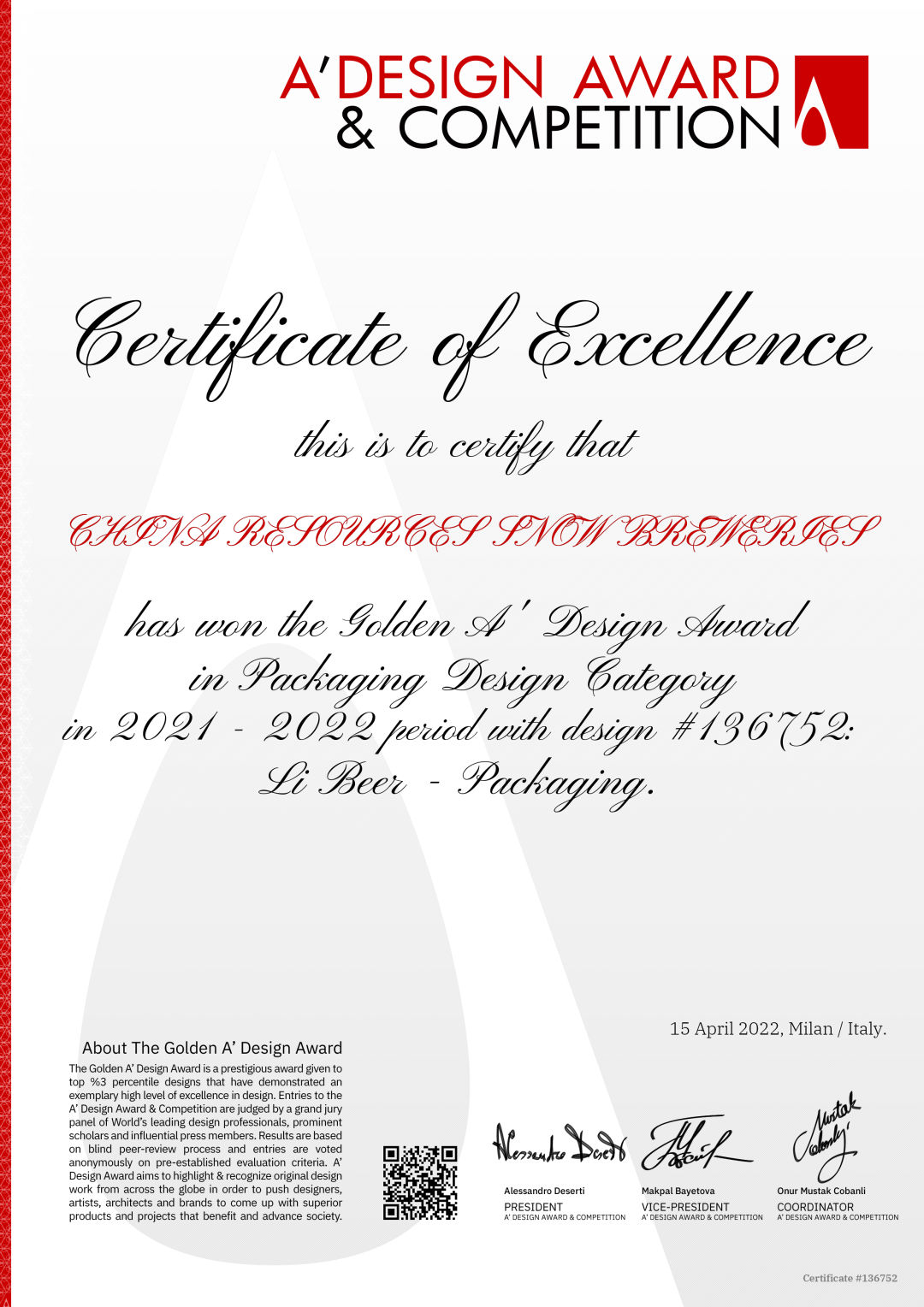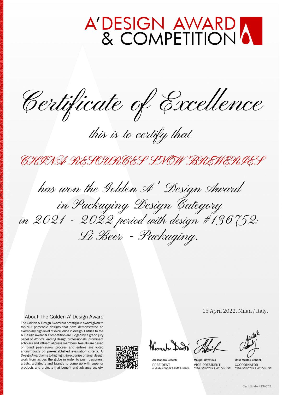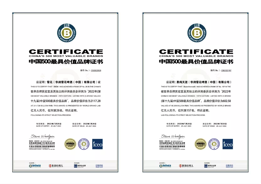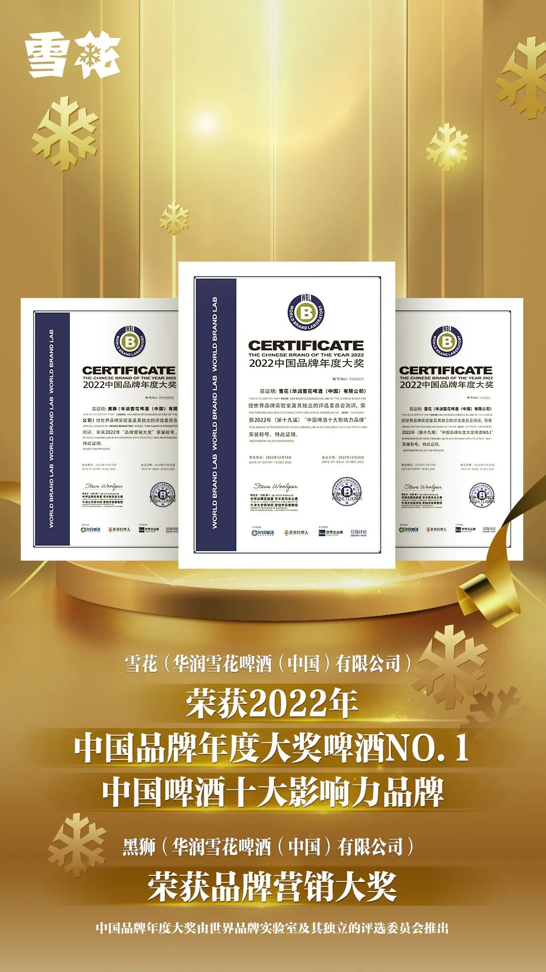 ◉ 荣获中国品牌力指数℠(C-BPI®)“啤酒行业第一”、连续8年蝉联中国顾客满意度指数SM (C-CSI®)第一名;“雪花”、“勇闯天涯”双品牌上榜《中国500最具价值品牌》,雪花品牌位列榜单28位,品牌价值超2000亿;金投赏商业创意奖年度品牌、“中国品牌年度大奖”啤酒行业(NO.1)。