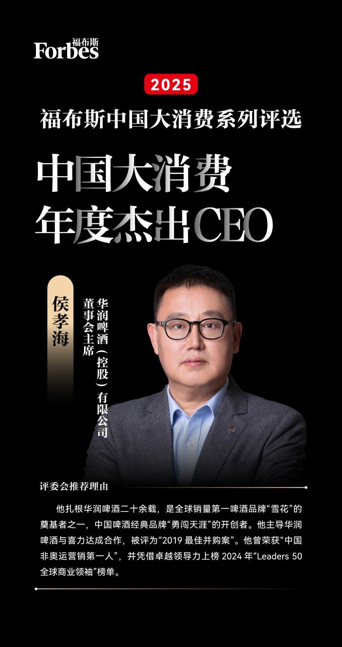 2025年3月7日,由沙利文与中国大消费CXO创新中心联合主办、福布斯中国特别支持的2025中国大消费产业盛典暨福布斯中国颁奖礼在上海举办。华润啤酒董事会主席侯孝海凭借卓越的领导力与战略远见,荣膺“中国大消费年度杰出CEO”。