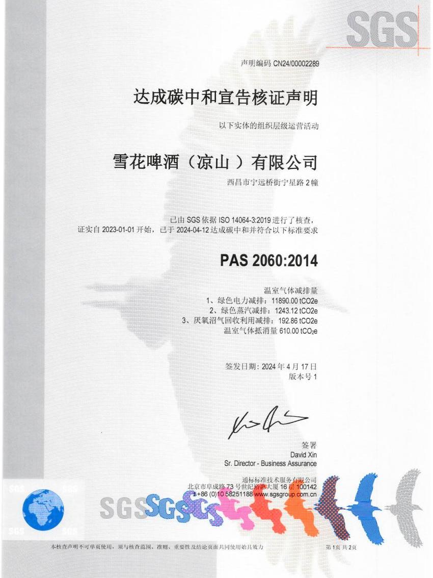 近日,雪花啤酒(凉山)有限公司(以下简称凉山工厂)荣获SGS通标标准技术服务有限公司颁发的碳中和证书。SGS是全球领先的检验、鉴定、测试和认证服务机构。此次认证,SGS通标标准技术服务有限公司依据ISO 14064-3:2019,通过对凉山工厂进行现场走访、交流访谈、会议沟通、数据收集、现状分析等诸多环节的全面调研考察,并对工厂碳排放状况进行分析计算,最终做出公正的核查结论。