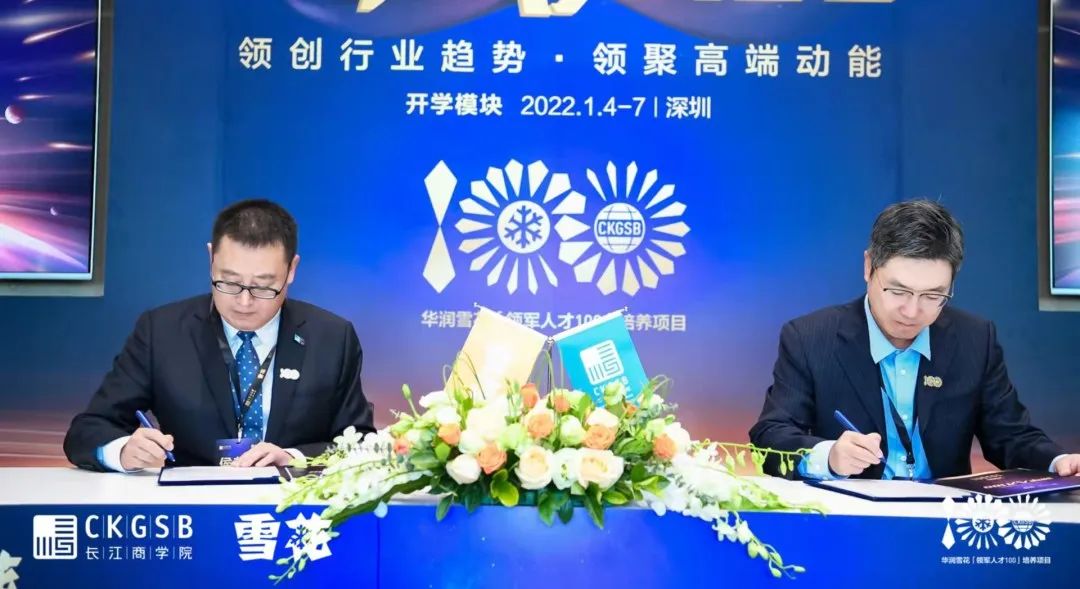开学典礼上,长江商学院与华润雪花正式签署了“领军人才100”培养项目合作备忘录。侯孝海总经理和项目学术主任滕斌圣教授为同学们颁发了录取通知书。